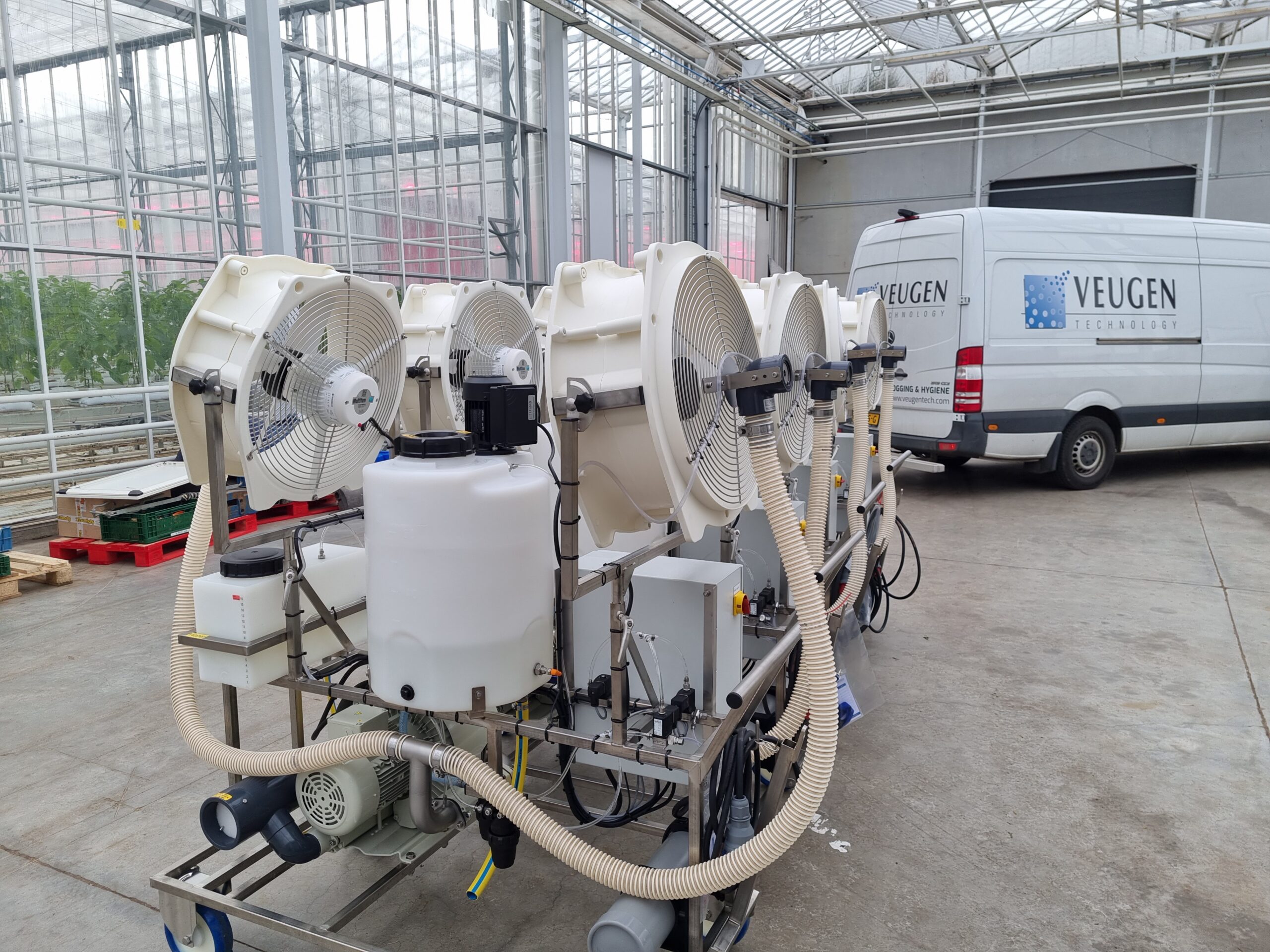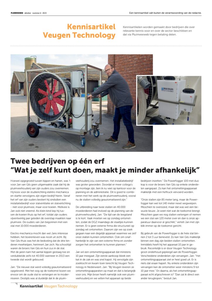 Op zolder staat de machine die het desinfectiemiddel automatisch doseert en daarna via leidingen verspreidt naar de nozzle-apparaten in de zes werkruimtes. Eéns per week, in de nacht van zaterdag op zondag, worden die ruimtes verneveld meteen desinfectiemiddel op basis van waterstofperoxide. De machine is aangesloten op ons alarm. Zetten we dat aan, dan hebben we er geen omkijken meer naar.” Het systeem werkt perfect, vertelt Meindert: “Alles in de ruimte, tot aan de binnenkant van kasten toe, wordt gedesinfecteerd. Bijkomend voordeel is dat ik nergens meer residu vind. Met het Halofog systeem van Veugen Technology hebben we dus de ideale balans gevonden tussen desinfectie en de juiste dosering. Tegenwoordig doen we wel acht tot tien weken met een jerrycan; dat scheelt zeker de helft.” Gaat het nooit mis met de desinfectie? Meindert: “Laatst deed ik een test met dipslides. De uitslag was nog binnen de marge, maar slechter dan normaal. Toen zag ik op het dashboard dat het alarm een paar keer niet was aangezet. Aan het systeem ligt het dus niet.”