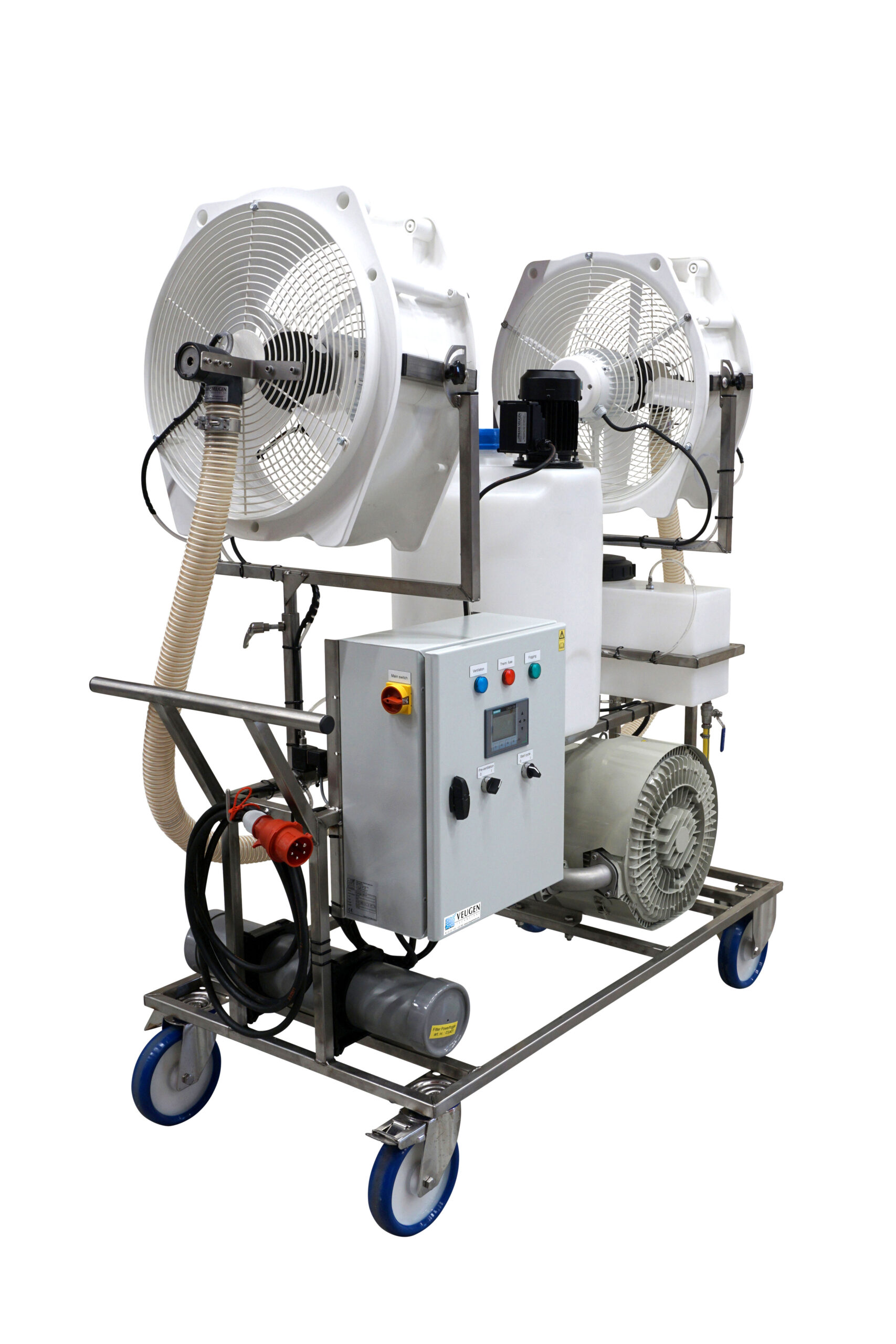 Met enkel een krachtstroomaansluiting kan de Powerfog TB60 wel 2 hectare vanuit 1 plek behandelen. Met 30 liter/uur is de capaciteit véél groter dan de conventionele LVM’s. Door het gebruik van lage druk sproeikoppen in plaats van hoge druk, is het ook mogelijk om poeders te vernevelen en is de kans op verstoppingen vele malen kleiner.